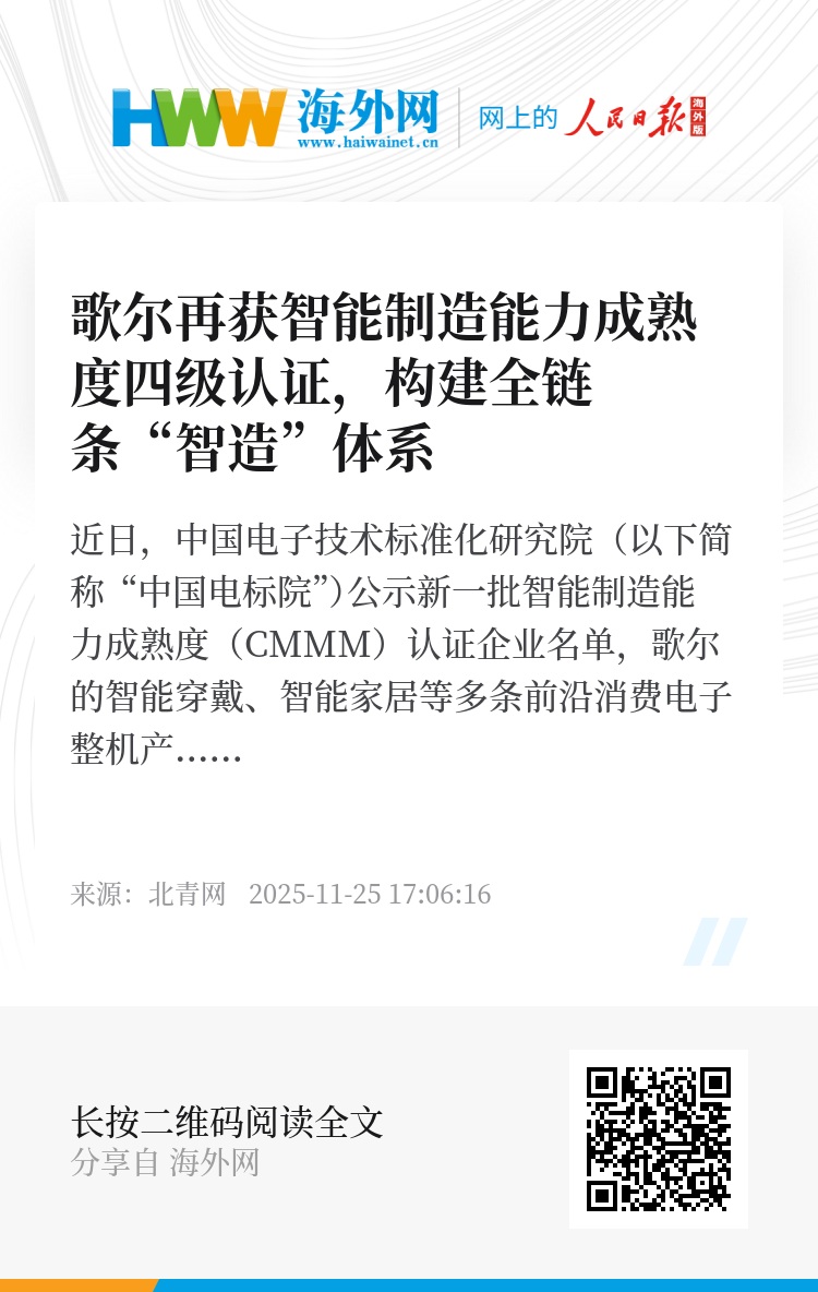 近日,中国电子技术标准化研究院(以下简称 “中国电标院”)公示新一批智能制造能力成熟度(CMMM)认证企业名单,歌尔的智能穿戴、智能家居等多条前沿消费电子整机产线顺利通过CMMM L4级(优化级)认证。这是歌尔继今年7月以扬声器及受话器等核心精密零组件业务拿下同级别认证后,再度斩获该领域当前最高等级认证,成为行业内少数实现“精密零组件+智能硬件整机”双赛道均达CMMM L4级标准的企业。