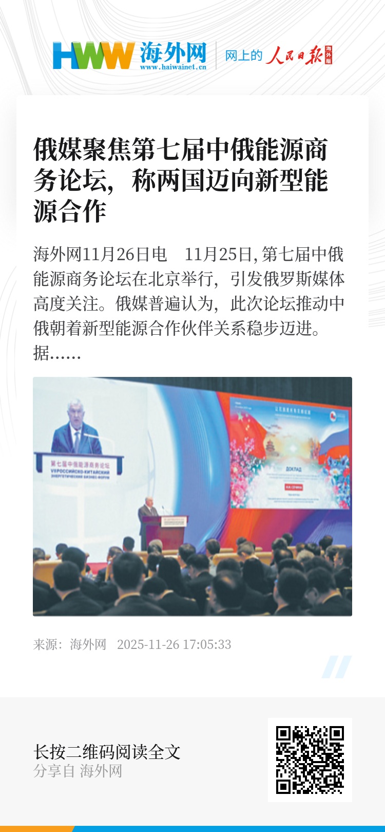 海外网11月26日电 11月25日,第七届中俄能源商务论坛在北京举行,引发俄罗斯媒体高度关注。俄媒普遍认为,此次论坛推动中俄朝着新型能源合作伙伴关系稳步迈进。