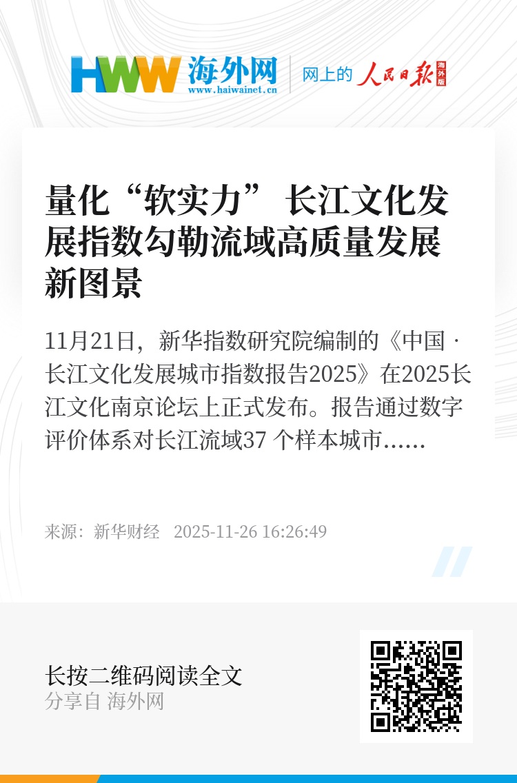 11月21日,新华指数研究院编制的《中国•长江文化发展城市指数报告2025》在2025长江文化南京论坛上正式发布。报告通过数字评价体系对长江流域37 个样本城市“精准画像”,将长江文化这一“软实力”转化为可衡量、可比较、可追踪的“硬指标”。报告显示,长江文化的保护、传承与发展水平与城市经济发展程度呈现显著的正相关性,一条以文化为内核、驱动区域高质量协同发展的新路径正清晰地铺展开来。