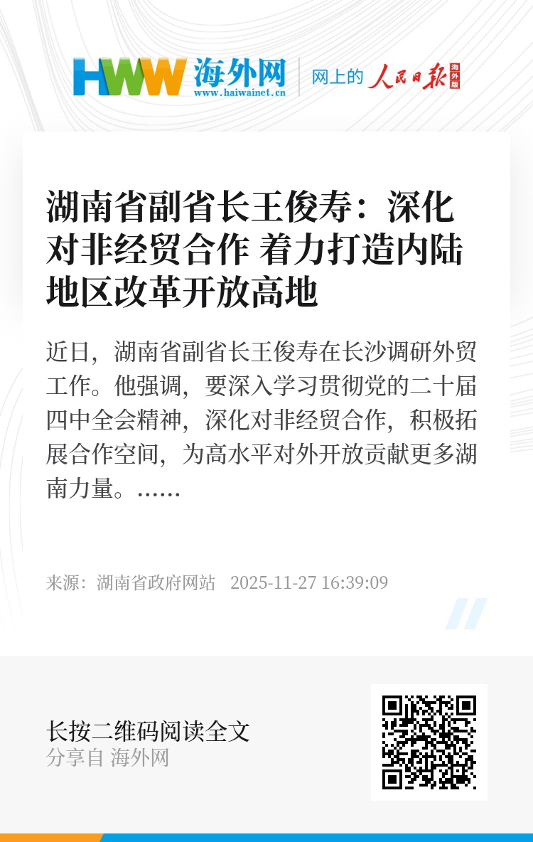 近日,湖南省副省长王俊寿在长沙调研外贸工作。他强调,要深入学习贯彻党的二十届四中全会精神,深化对非经贸合作,积极拓展合作空间,为高水平对外开放贡献更多湖南力量。