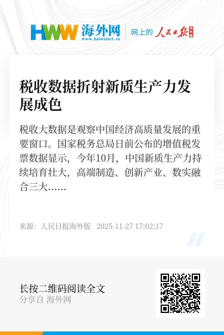 税收大数据是观察中国经济高质量发展的重要窗口。国家税务总局日前公布的增值税发票数据显示,今年10月,中国新质生产力持续培育壮大,高端制造、创新产业、数实融合三大领域均呈现稳健增长态势,为经济发展持续注入新活力。
