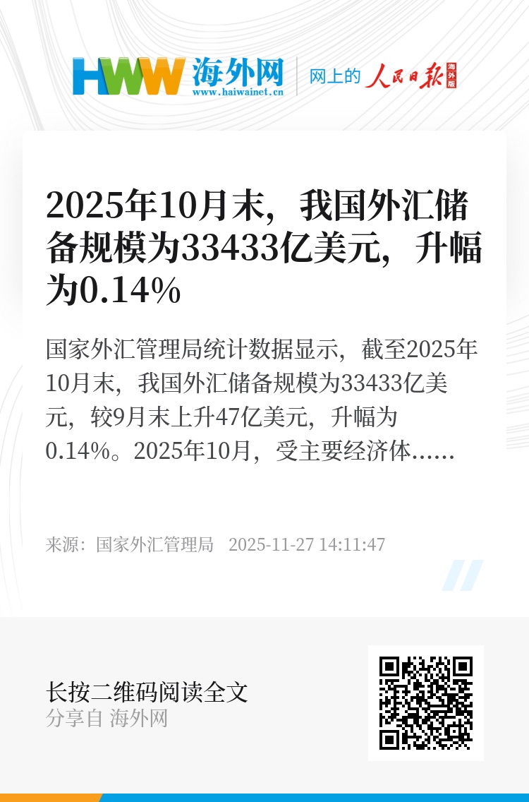 国家外汇管理局统计数据显示,截至2025年10月末,我国外汇储备规模为33433亿美元,较9月末上升47亿美元,升幅为0.14%。
