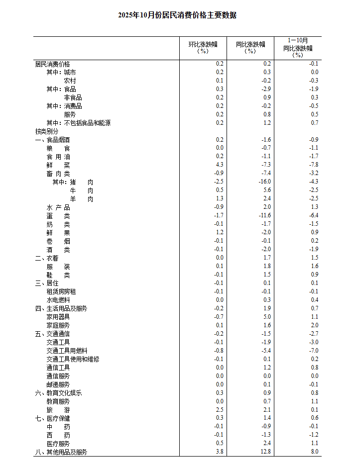 2025年10月份,全国居民消费价格同比上涨0.2%。其中,城市上涨0.3%,农村下降0.2%;食品价格下降2.9%,非食品价格上涨0.9%;消费品价格下降0.2%,服务价格上涨0.8%。1—10月平均,全国居民消费价格比上年同期下降0.1%。