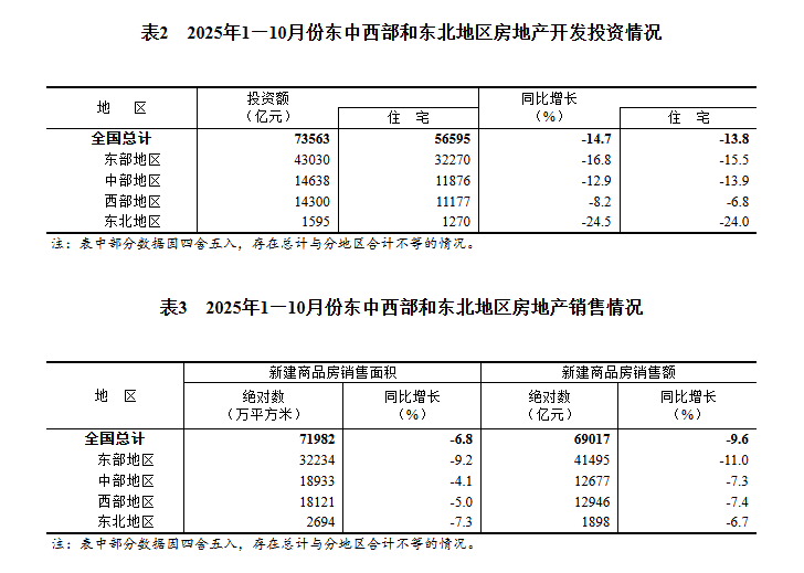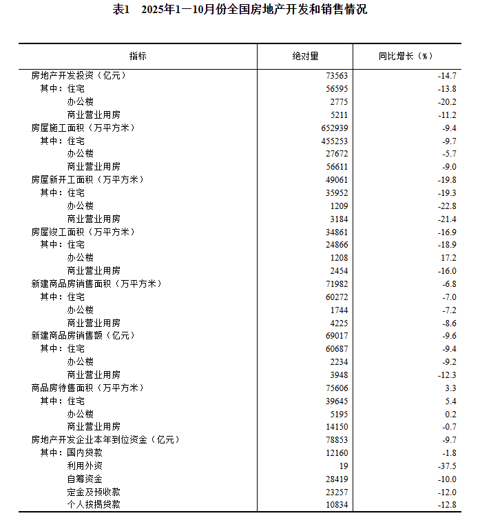 1—10月份,全国房地产开发投资73563亿元,同比下降14.7%(按可比口径计算);其中,住宅投资56595亿元,下降13.8%。