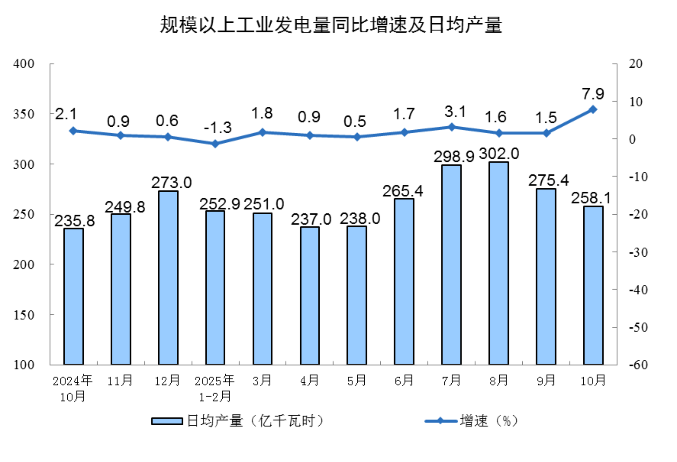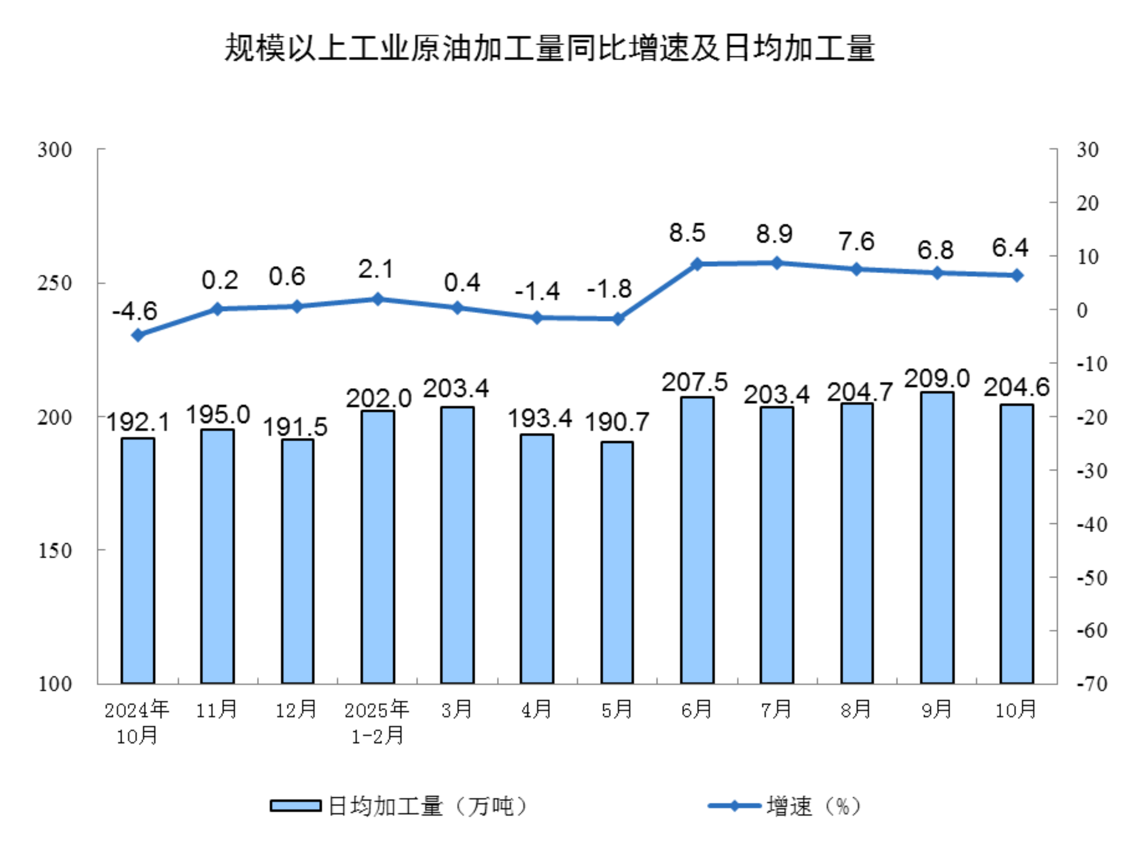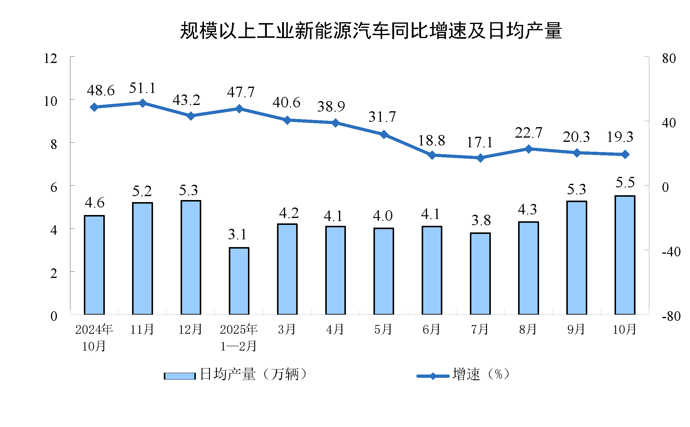 分产品看,10月份,规模以上工业623种产品中有313种产品产量同比增长。其中,钢材11864万吨,同比下降0.9%;水泥14775万吨,下降15.8%;十种有色金属695万吨,增长2.9%;乙烯314万吨,增长11.7%;汽车327.9万辆,增长11.2%,其中新能源汽车171.0万辆,增长19.3%;发电量8002亿千瓦时,增长7.9%;原油加工量6343万吨,增长6.4%。