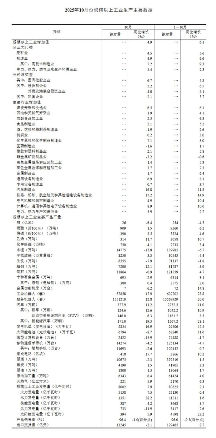 10月份,规模以上工业增加值同比实际增长4.9%(增加值增速均为扣除价格因素的实际增长率)。从环比看,10月份,规模以上工业增加值比上月增长0.17%。1—10月份,规模以上工业增加值同比增长6.1%。