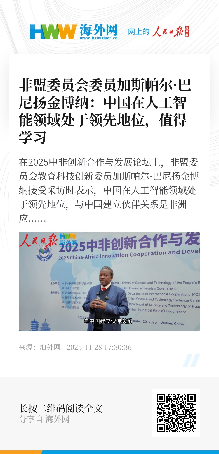 在2025中非创新合作与发展论坛上,非盟委员会教育科技创新委员加斯帕尔·巴尼扬金博纳接受采访时表示,中国在人工智能领域处于领先地位,与中国建立伙伴关系是非洲应该走的道路。