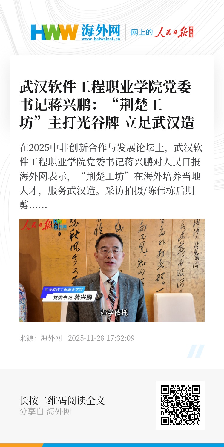 在2025中非创新合作与发展论坛上,武汉软件工程职业学院党委书记蒋兴鹏对人民日报海外网表示,“荆楚工坊”在海外培养当地人才,服务武汉造。