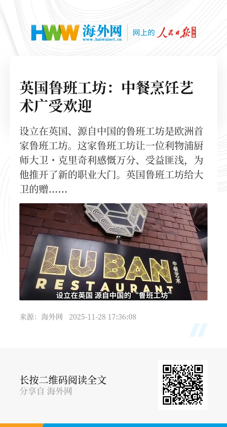 “大卫做的菜非常好吃,中国菜很棒”“这些中餐和我之前在英国吃过的完全不一样”“鲁班餐厅是利物浦最受欢迎的餐厅之一,在本地很受欢迎,中式晚宴菜单很快卖空了”鲁班工坊赋予大卫的,不仅是专业技能,还有被认可的专业标准。英国鲁班工坊联合英国院校开发的中餐课程,被纳入了当地学历体系,这意味着大卫学到的技艺有了国际认可的“通行证”。