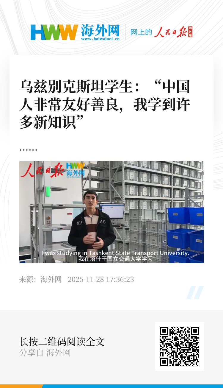 乌兹别克斯坦学生:“中国人非常友好善良,我学到许多新知识”