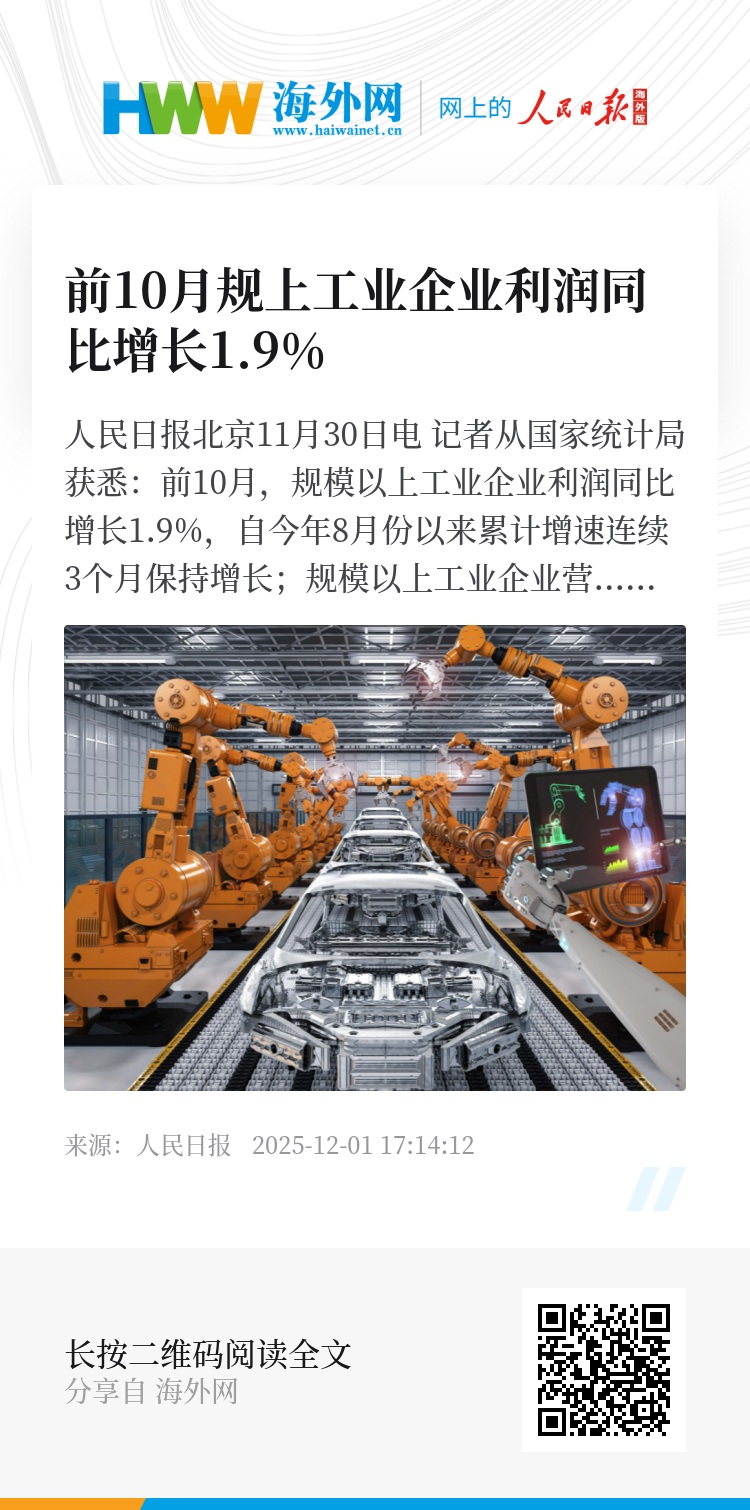 人民日报北京11月30日电 记者从国家统计局获悉:前10月,规模以上工业企业利润同比增长1.9%,自今年8月份以来累计增速连续3个月保持增长;规模以上工业企业营业收入同比增长1.8%,为工业企业盈利恢复创造有利条件。10月份,受上年同期基数有所抬高、财务费用增长较快等因素影响,规模以上工业企业利润同比下降5.5%。