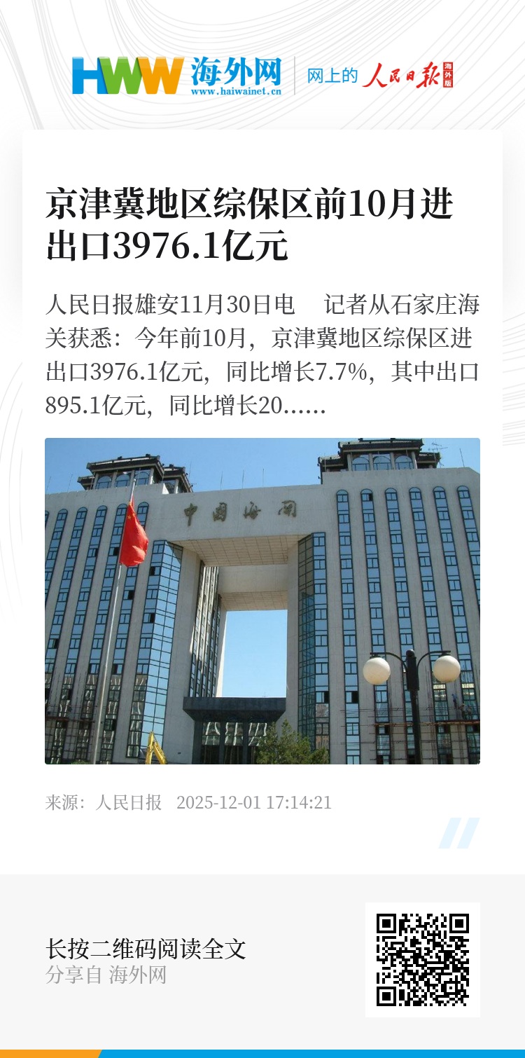 人民日报雄安11月30日电 记者从石家庄海关获悉:今年前10月,京津冀地区综保区进出口3976.1亿元,同比增长7.7%,其中出口895.1亿元,同比增长20.3%,进口3081亿元,同比增长4.5%。其中,雄安综保区进出口396.2亿元。