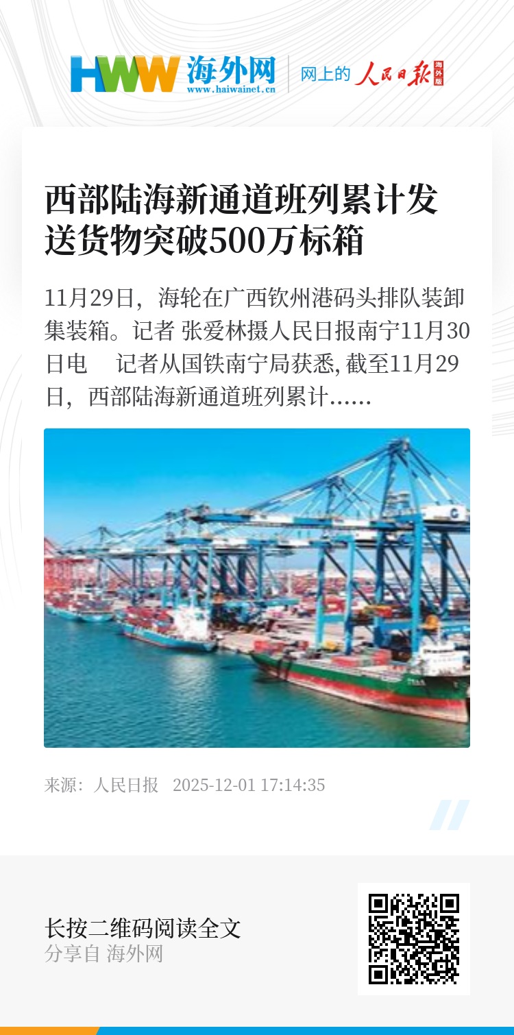 人民日报南宁11月30日电 记者从国铁南宁局获悉,截至11月29日,西部陆海新通道班列累计发送集装箱货物突破500万标箱、达500.3万标箱,其中今年以来发送突破130万标箱、达130.8万标箱,同比增长55.3%,保持强劲增长势头。