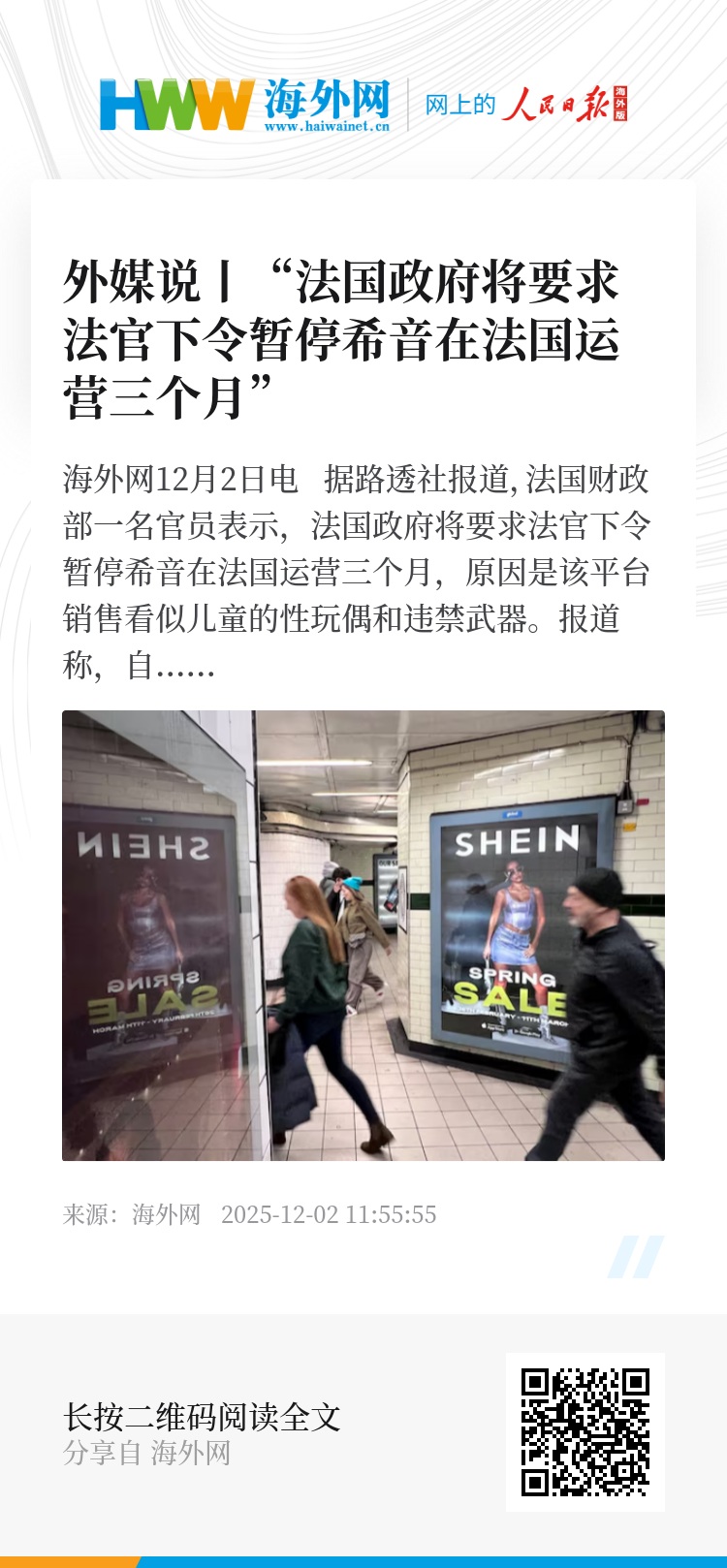 海外网12月2日电 据路透社报道,法国财政部一名官员表示,法国政府将要求法官下令暂停希音在法国运营三个月,原因是该平台销售看似儿童的性玩偶和违禁武器。