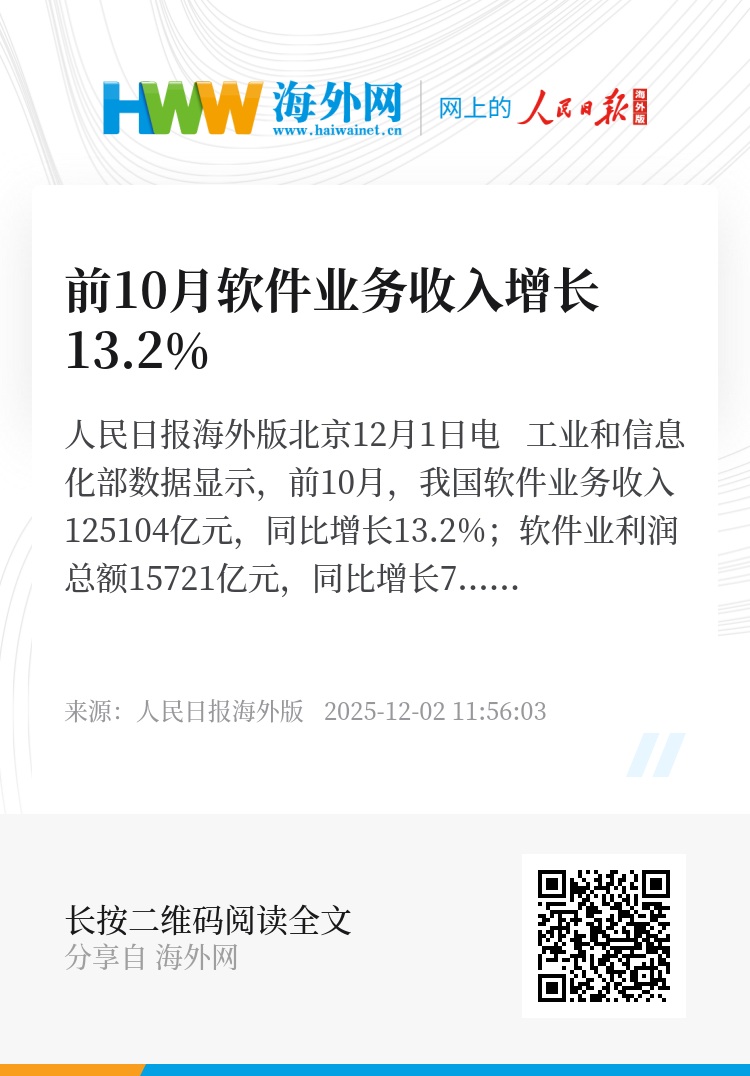 人民日报海外版北京12月1日电 工业和信息化部数据显示,前10月,我国软件业务收入125104亿元,同比增长13.2%;软件业利润总额15721亿元,同比增长7.7%;软件业务出口510.9亿美元,同比增长6.7%,增速连续8个月保持正增长。