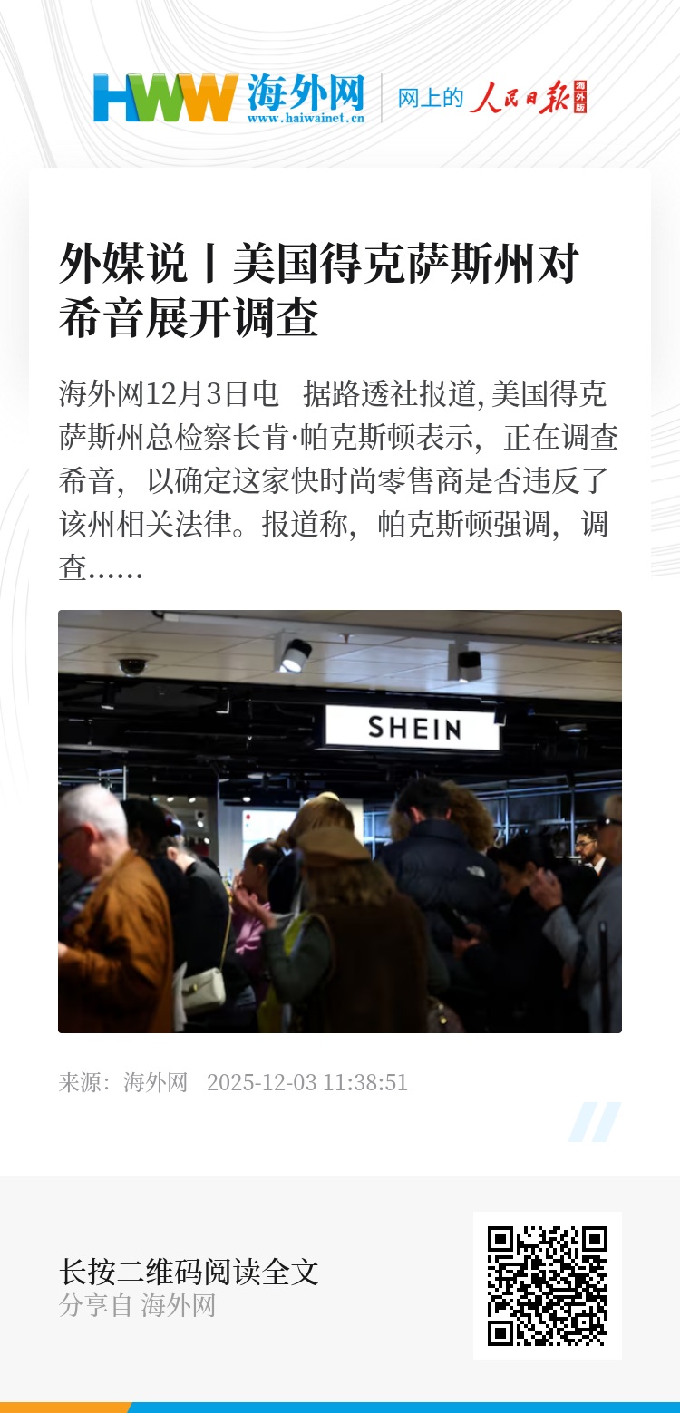 海外网12月3日电 据路透社报道,美国得克萨斯州总检察长肯·帕克斯顿表示,正在调查希音,以确定这家快时尚零售商是否违反了该州相关法律。
