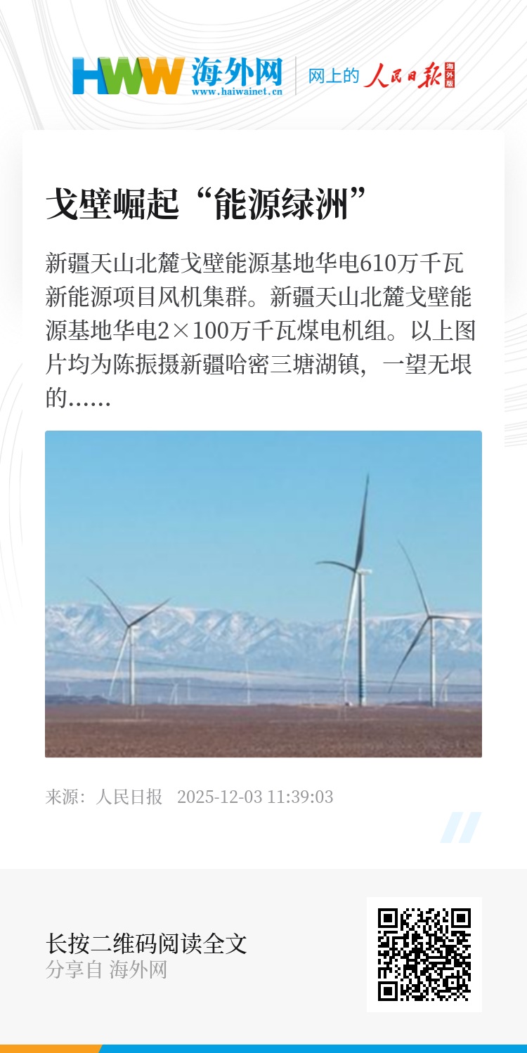 据介绍,新疆天山北麓戈壁能源基地全部机组投产发电后,每年将有360亿千瓦时绿电通过哈密—重庆±800千伏特高压工程直送川渝大地,昔日的“不毛之地”将变成“能源绿洲”。