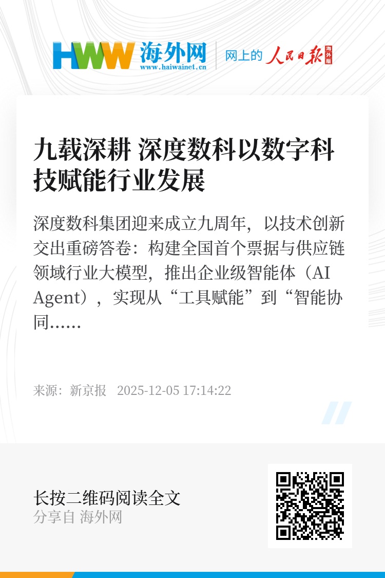 深度数科集团迎来成立九周年,以技术创新交出重磅答卷:构建全国首个票据与供应链领域行业大模型,推出企业级智能体(AI Agent),实现从“工具赋能”到“智能协同”的跨越,用技术革命重塑信任效率,为九周年庆典注入强劲的智能动能。深度数科集团董事长全传晓在公开信中强调,九年来算力的澎湃发展,不应只是技术狂欢,更应成为诚信的基石。