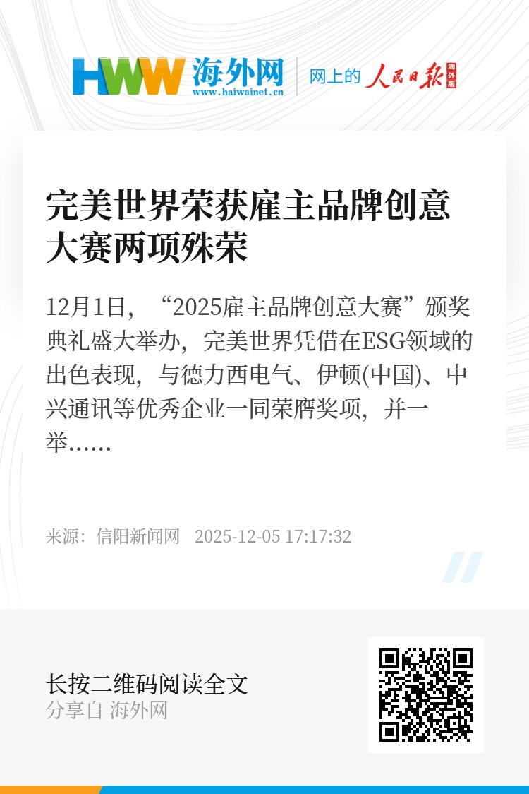 12月1日,“2025雇主品牌创意大赛”颁奖典礼盛大举办,完美世界凭借在ESG领域的出色表现,与德力西电气、伊顿(中国)、中兴通讯等优秀企业一同荣膺奖项,并一举荣获“最佳可持续发展奖”和“最佳社会责任奖”两项殊荣。