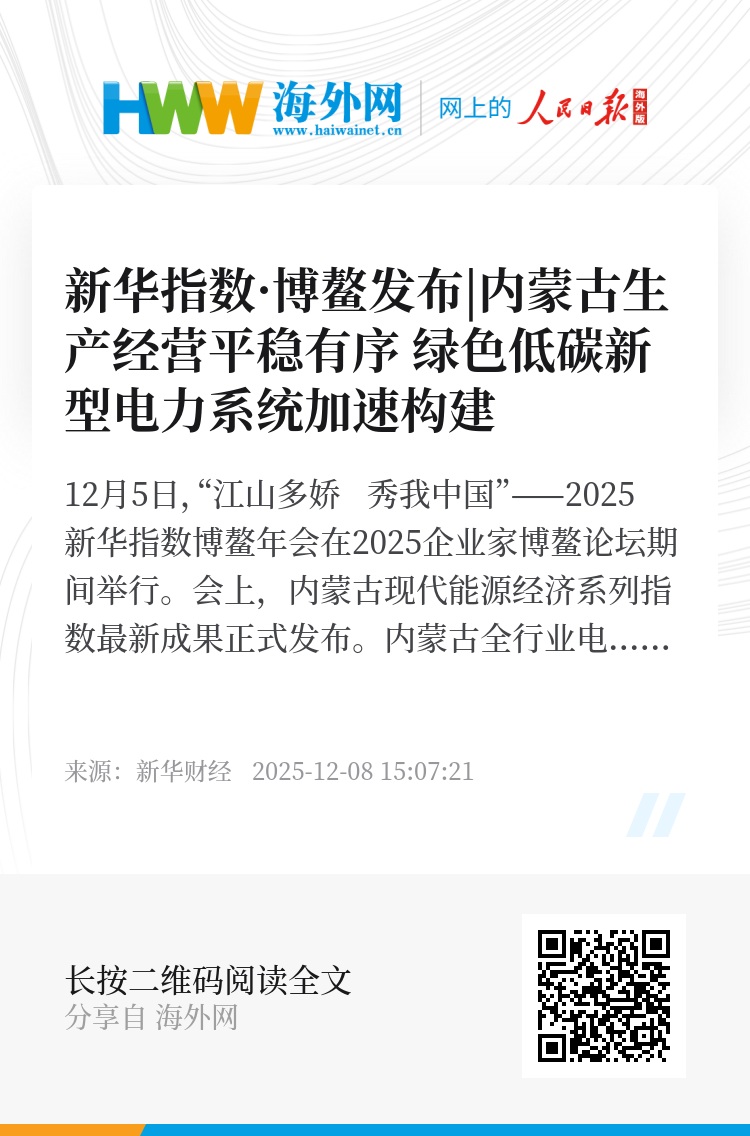 12月5日,“江山多娇 秀我中国”——2025新华指数博鳌年会在2025企业家博鳌论坛期间举行。会上,内蒙古现代能源经济系列指数最新成果正式发布。