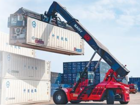 在中老铁路万象南货运口岸站,起重机吊起即将发往中国的冷链集装箱。