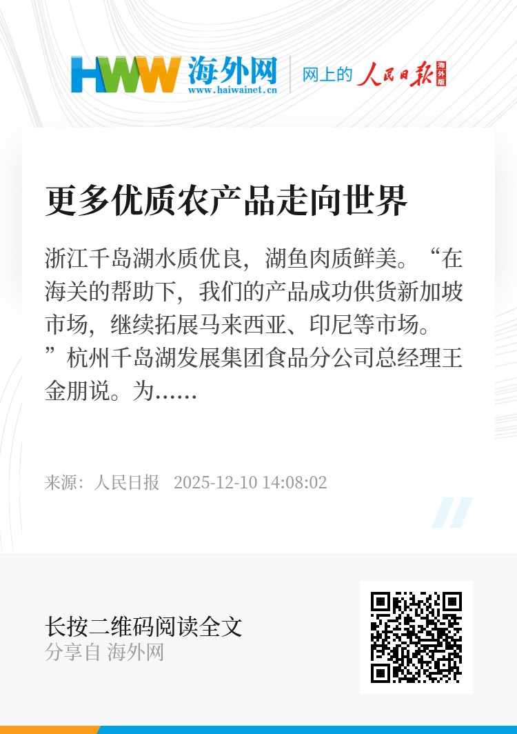 浙江千岛湖水质优良,湖鱼肉质鲜美。“在海关的帮助下,我们的产品成功供货新加坡市场,继续拓展马来西亚、印尼等市场。”杭州千岛湖发展集团食品分公司总经理王金朋说。