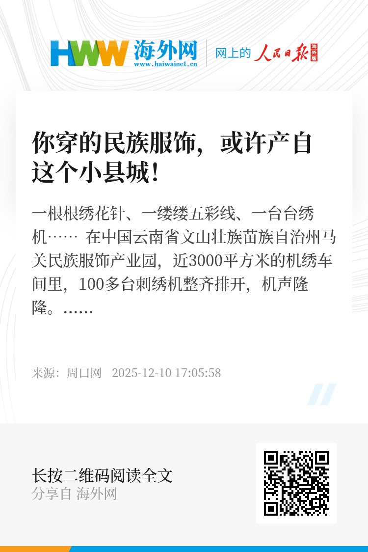 一根根绣花针、一缕缕五彩线、一台台绣机…… 在中国云南省文山壮族苗族自治州马关民族服饰产业园,近3000平方米的机绣车间里,100多台刺绣机整齐排开,机声隆隆。工人们正紧张地抓生产、赶订单,不一会儿,一幅幅绣有花鸟鱼虫或特色民族图案的精美绣品便成形了。如今这里采用 “电脑设计花样模板 + 绣花机制作” 的模式,既能大幅提高生产效率,又完整保留了民族刺绣的传统韵味,成品针脚细密、图案精致,深受市场青睐。
