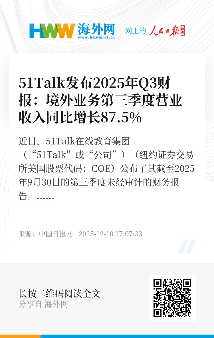 近日,51Talk在线教育集团(“51Talk”或“公司”)(纽约证券交易所美国股票代码:COE)公布了其截至2025年9月30日的第三季度未经审计的财务报告。