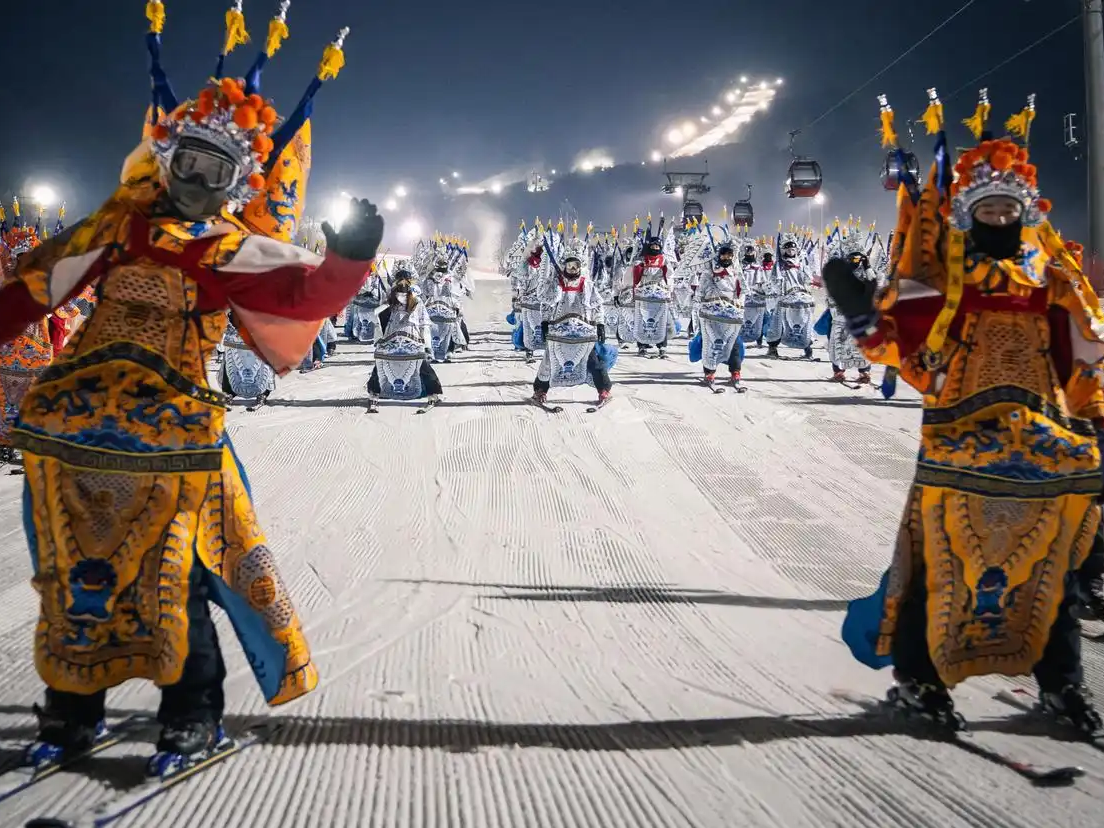 11月21日,滑雪者身着京剧服饰在中旅松花湖度假区进行滑雪表演。新华社记者许畅 摄