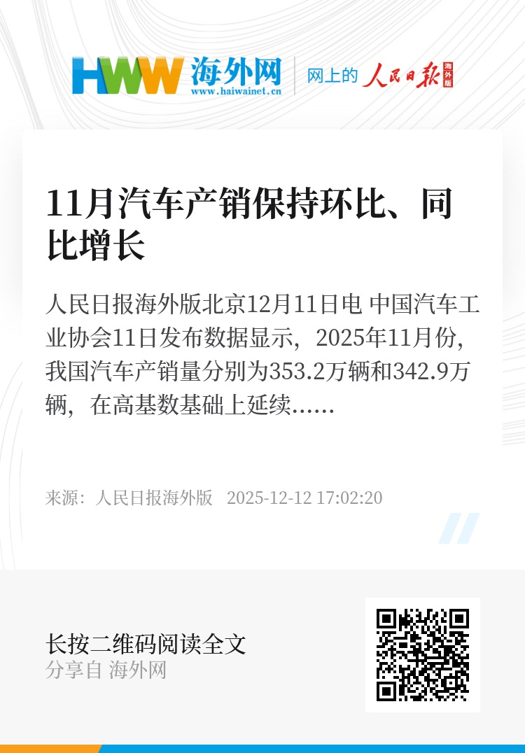 人民日报海外版北京12月11日电 中国汽车工业协会11日发布数据显示,2025年11月份,我国汽车产销量分别为353.2万辆和342.9万辆,在高基数基础上延续增长态势,产销环比、同比均实现增长。