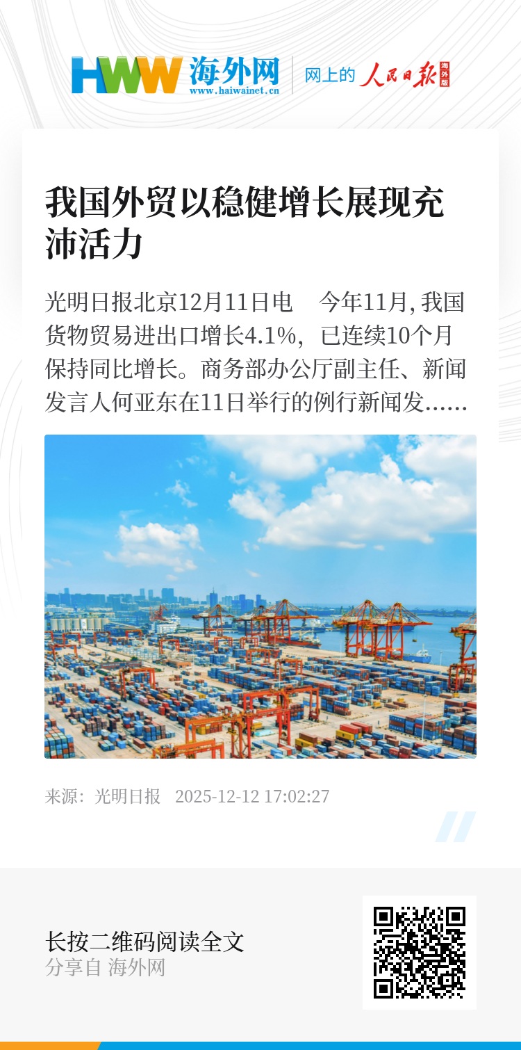 光明日报北京12月11日电 今年11月,我国货物贸易进出口增长4.1%,已连续10个月保持同比增长。商务部办公厅副主任、新闻发言人何亚东在11日举行的例行新闻发布会上表示,今年以来,面对复杂严峻的外部环境,中国外贸逆势而上,实现量稳质升,以稳健的增长展现充沛的活力。