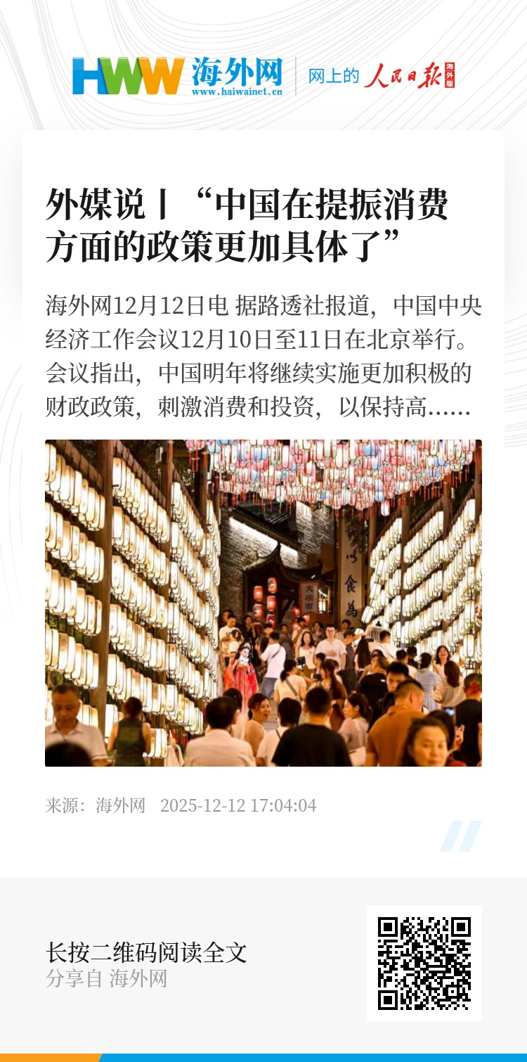 海外网12月12日电 据路透社报道,中国中央经济工作会议12月10日至11日在北京举行。会议指出,中国明年将继续实施更加积极的财政政策,刺激消费和投资,以保持高速增长。