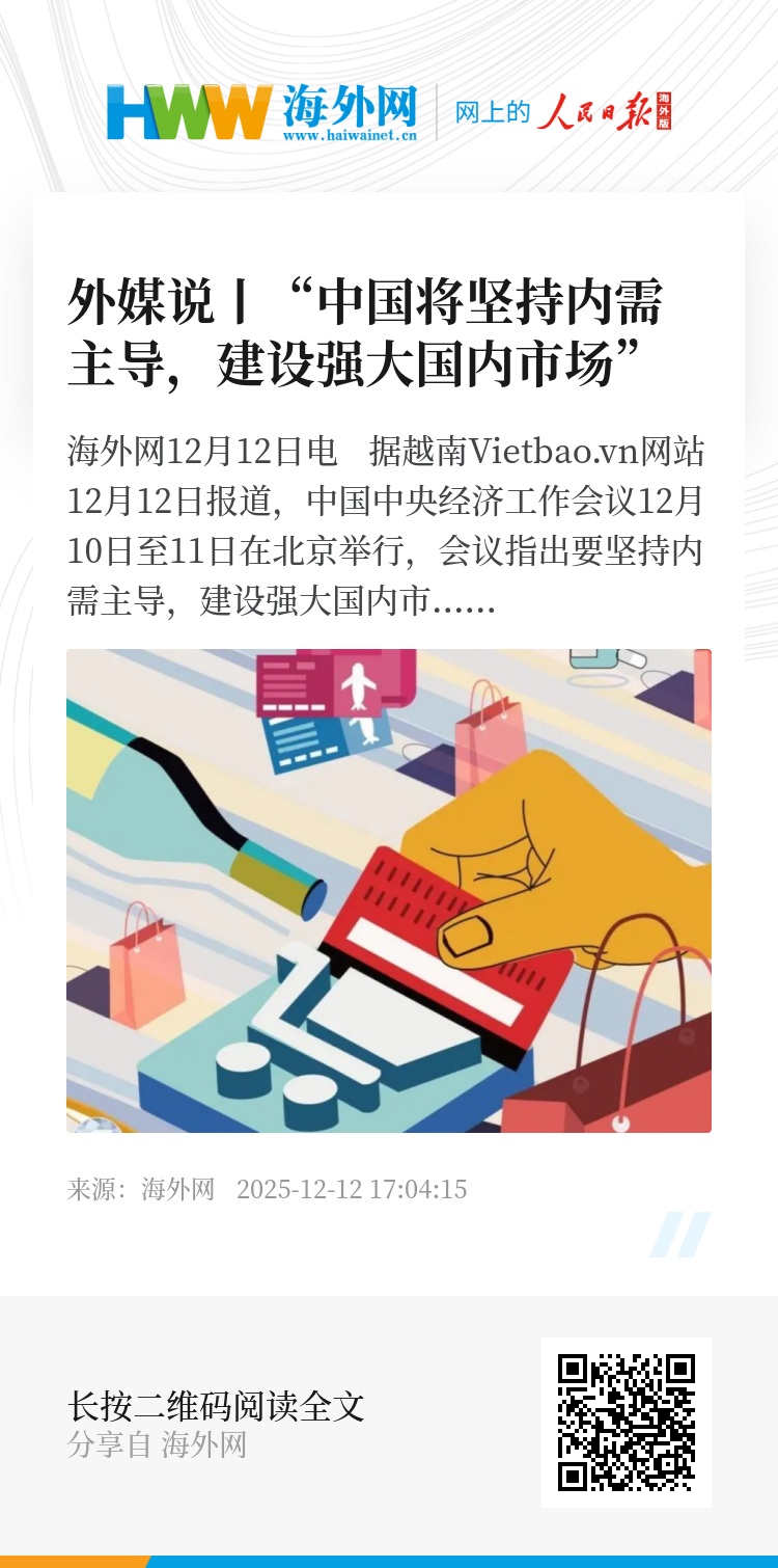 海外网12月12日电 据越南Vietbao.vn网站12月12日报道,中国中央经济工作会议12月10日至11日在北京举行,会议指出要坚持内需主导,建设强大国内市场。