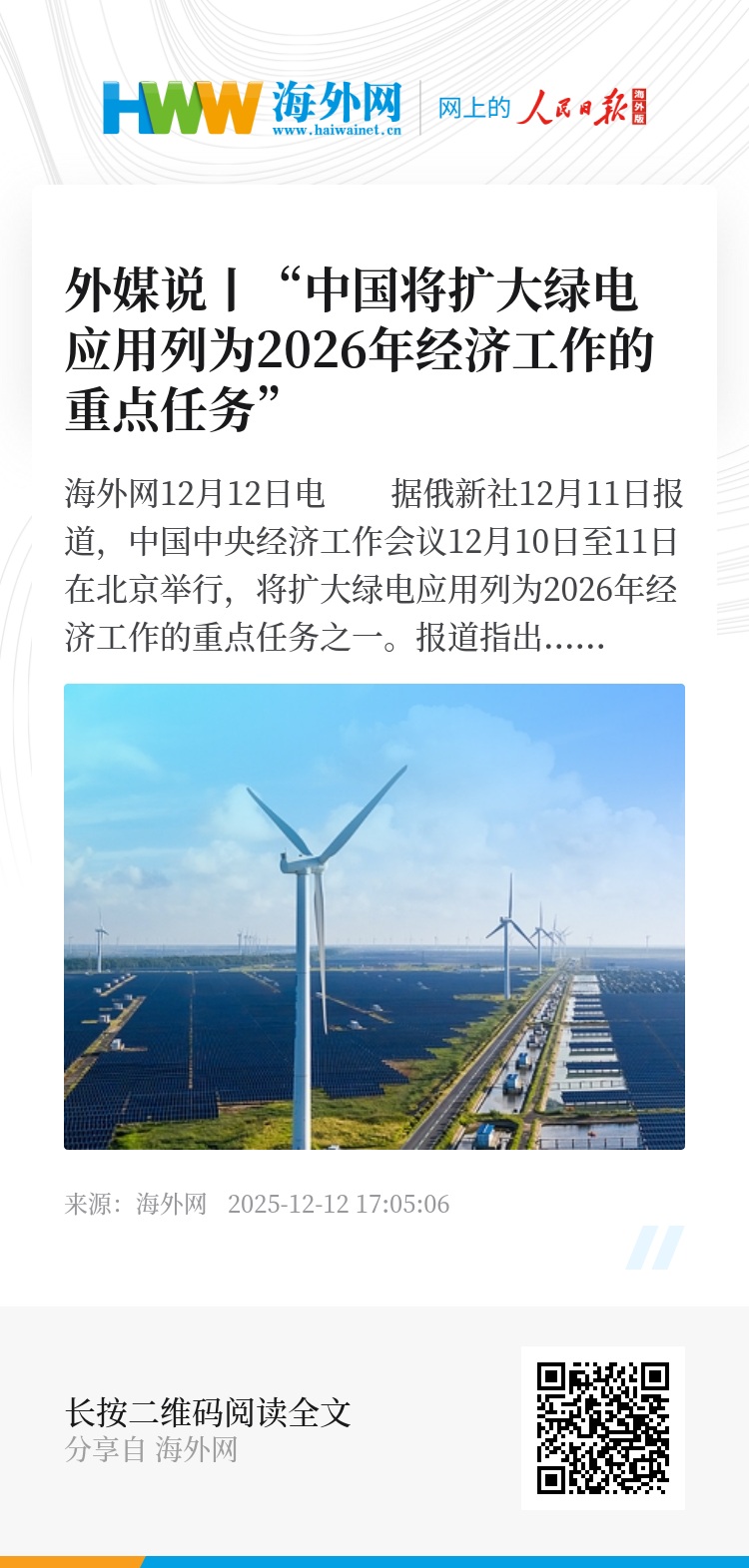 海外网12月12日电 据俄新社12月11日报道,中国中央经济工作会议12月10日至11日在北京举行,将扩大绿电应用列为2026年经济工作的重点任务之一。