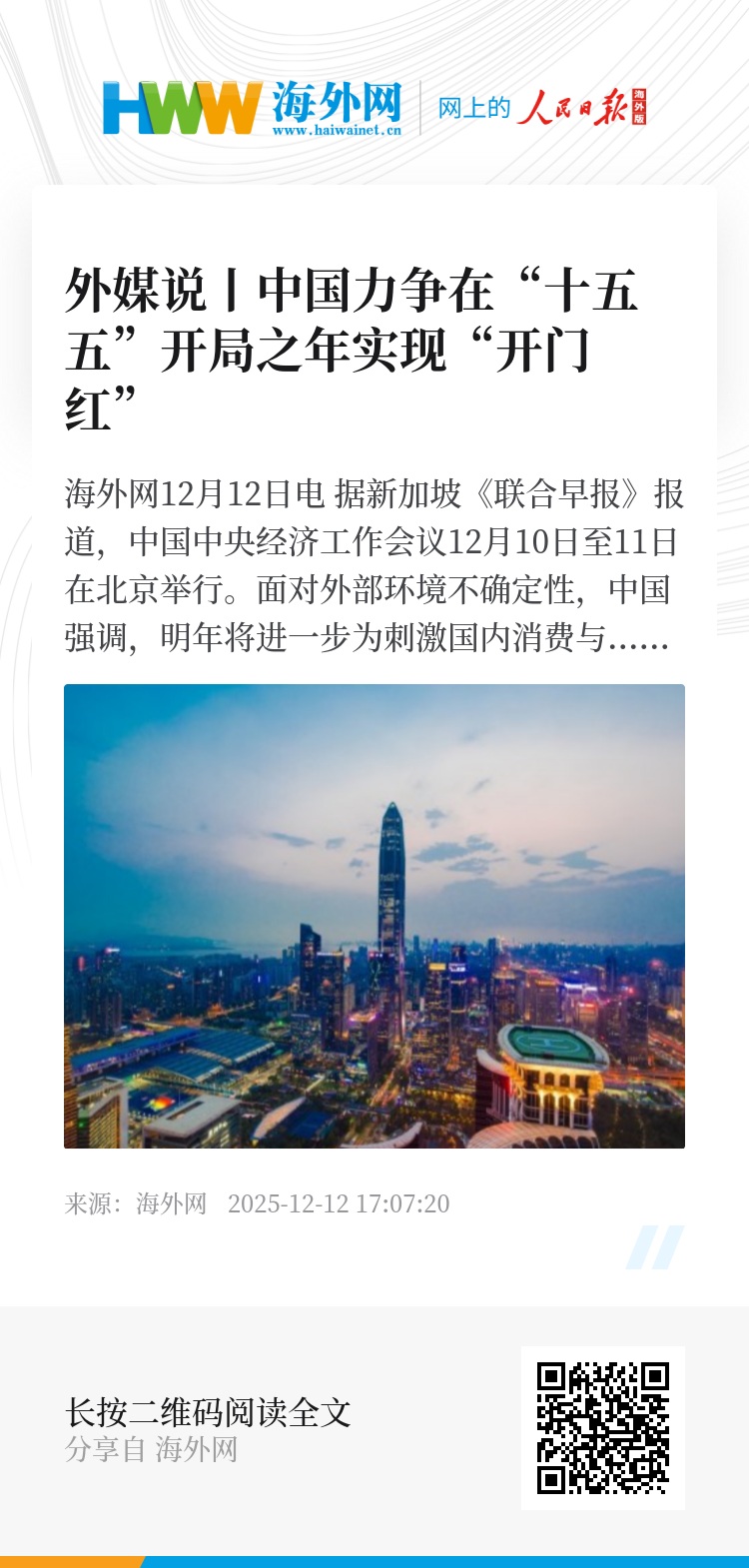 海外网12月12日电 据新加坡《联合早报》报道,中国中央经济工作会议12月10日至11日在北京举行。面对外部环境不确定性,中国强调,明年将进一步为刺激国内消费与投资、维持经济增长动能提供支撑。
