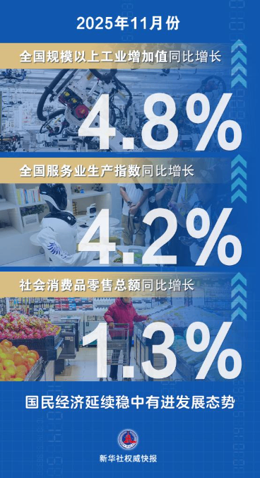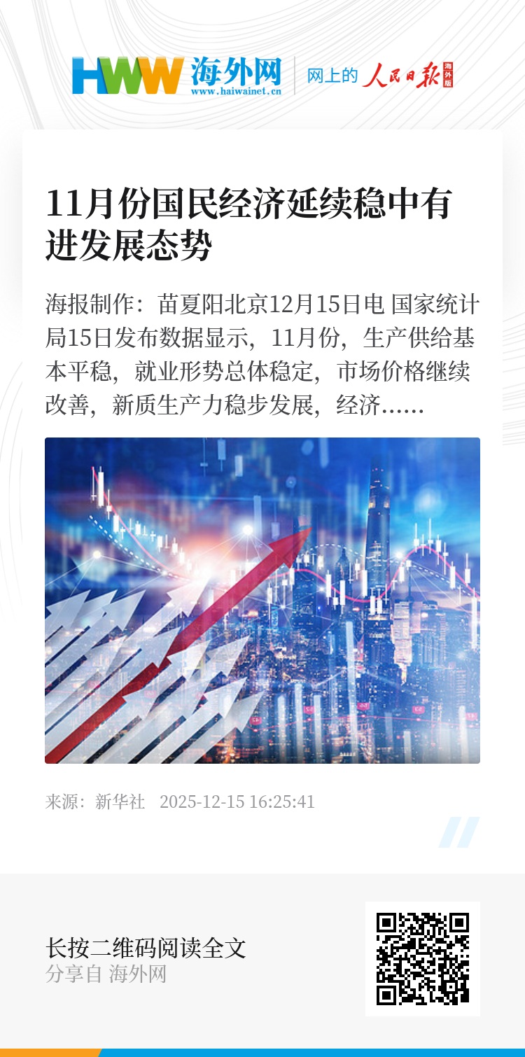 新华社北京12月15日电 国家统计局15日发布数据显示,11月份,生产供给基本平稳,就业形势总体稳定,市场价格继续改善,新质生产力稳步发展,经济运行延续总体平稳、稳中有进发展态势。