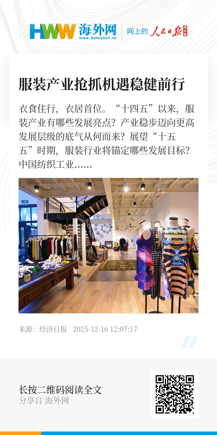 衣食住行,衣居首位。“十四五”以来,服装产业有哪些发展亮点?产业稳步迈向更高发展层级的底气从何而来?展望“十五五”时期,服装行业将锚定哪些发展目标?中国纺织工业联合会副会长、中国服装协会会长陈大鹏近日接受了经济日报记者专访,深入解读服装产业发展脉络。