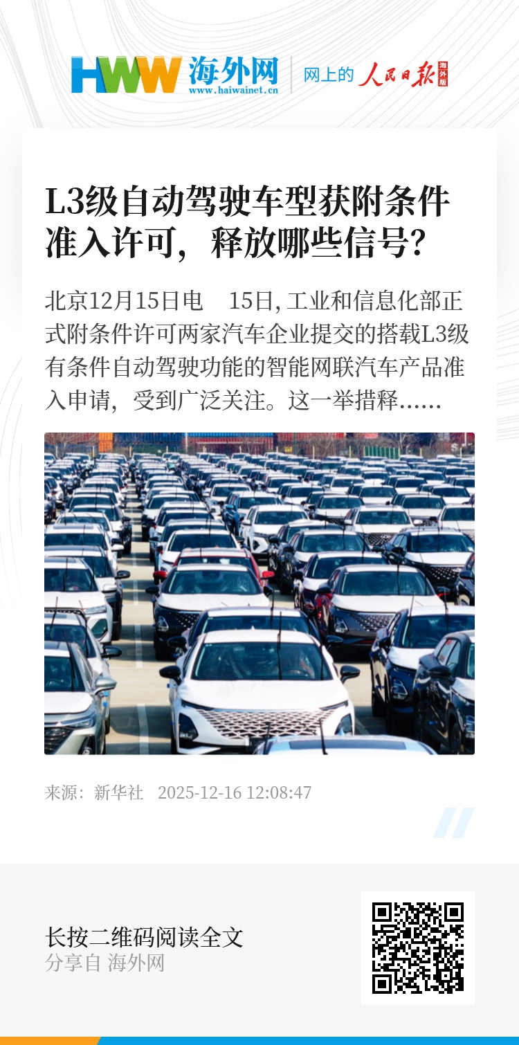 新华社北京12月15日电 15日,工业和信息化部正式附条件许可两家汽车企业提交的搭载L3级有条件自动驾驶功能的智能网联汽车产品准入申请,受到广泛关注。这一举措释放哪些信号?记者采访了专家。