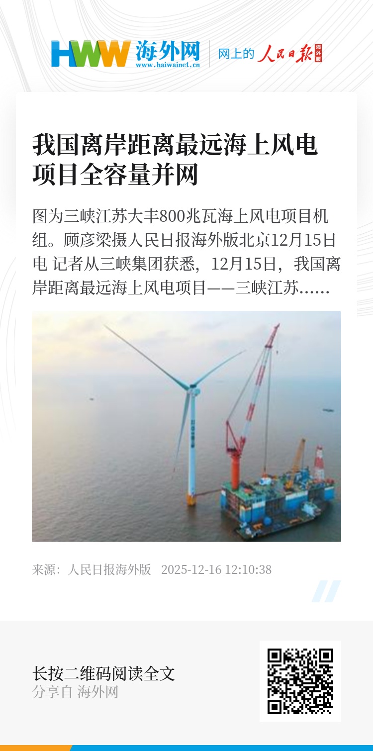 人民日报海外版北京12月15日电 记者从三峡集团获悉,12月15日,我国离岸距离最远海上风电项目——三峡江苏大丰800兆瓦海上风电项目实现全容量并网,标志着我国海上风电向深远海迈进取得了又一重大突破。