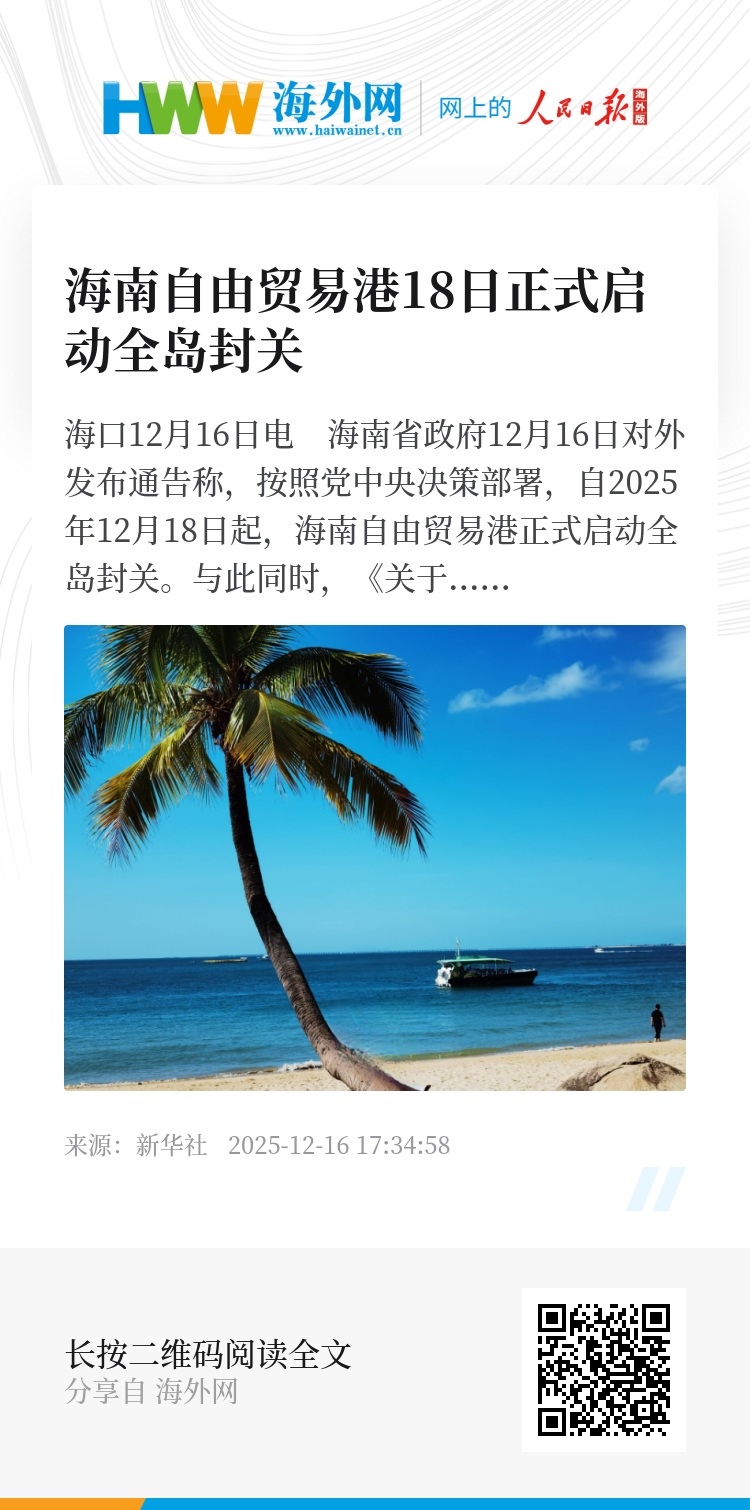 新华社海口12月16日电 海南省政府12月16日对外发布通告称,按照党中央决策部署,自2025年12月18日起,海南自由贸易港正式启动全岛封关。