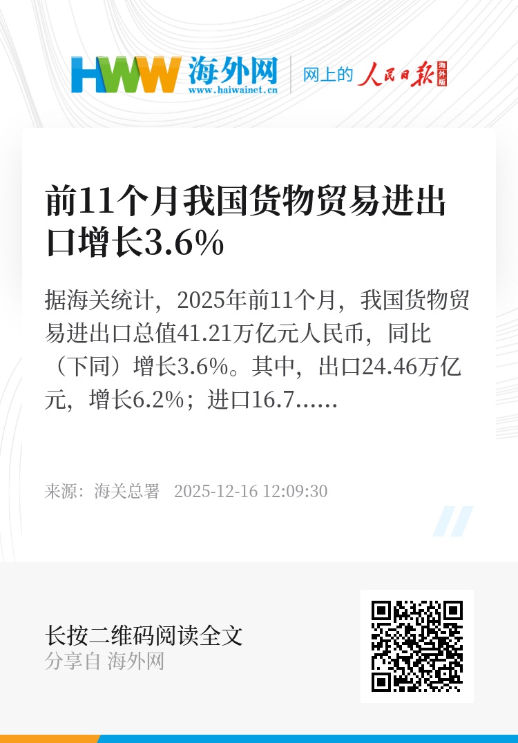 据海关统计,2025年前11个月,我国货物贸易进出口总值41.21万亿元人民币,同比(下同)增长3.6%。其中,出口24.46万亿元,增长6.2%;进口16.75万亿元,增长0.2%。11月份,我国货物贸易增速回升,进出口总值3.9万亿元,增长4.1%。其中,出口2.35万亿元,增长5.7%;进口1.55万亿元,增长1.7%。