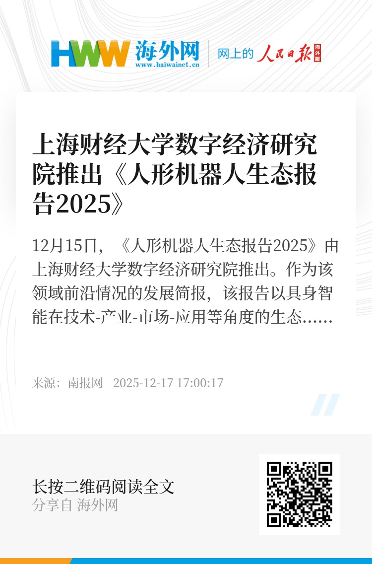 12月15日,《人形机器人生态报告2025》由上海财经大学数字经济研究院推出。作为该领域前沿情况的发展简报,该报告以具身智能在技术-产业-市场-应用等角度的生态化进展为基础,聚焦在更受各方关注的人形机器人方向,建立面向人形机器人的多维观察和动态研究框架,从生态演进的总体特征、技术体系与产业链、产品与企业、产业经济、场景与应用等角度,观察人形机器人在中国的年度进展,以资各方参考。