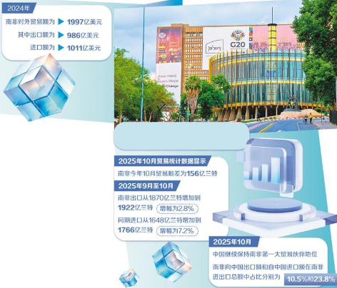 南非税务总局(SARS)11月28日发布的2025年10月贸易统计数据显示,南非今年10月贸易顺差为156亿兰特。2025年9月至10月,南非出口从1870亿兰特增加到1922亿兰特,增幅为2.8%,同期进口从1648亿兰特增加到1766亿兰特,增幅为7.2%。数据显示,2025年10月,中国继续保持南非第一大贸易伙伴地位,南非向中国出口额和自中国进口额在南非进出口总额中的占比分别为10.5%和23.8%,南中贸易额在南非对外贸易额中的占比大幅领先于南非与其他贸易伙伴。