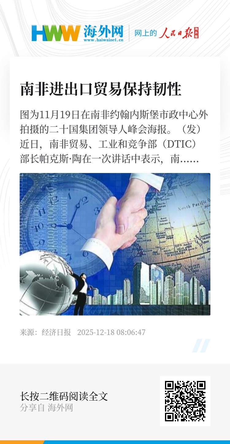 世界贸易组织总干事伊维拉此前警告,关税正在对国际贸易体系造成80年来“前所未见”的破坏,全球在世贸组织条款下进行的贸易占比已降至72%,之后可能进一步下滑。这些变化是由日益加剧的地缘政治紧张局势和大国竞争所驱动的,并正在造成不确定性,以及削弱可预测的、基于规则的贸易。帕克斯·陶表示,南非享受美国《非洲增长与机遇法案》(AGOA)的待遇已于今年9月底到期,南非将继续与美国就互惠贸易协议进行磋商,以降低目前美国对南非征收的关税,从而使南非出口更具竞争力,但相关磋商谈判尚无结果。鉴于此,南非需要加强其工业基础,实现贸易伙伴多元化,并增强经济韧性。
