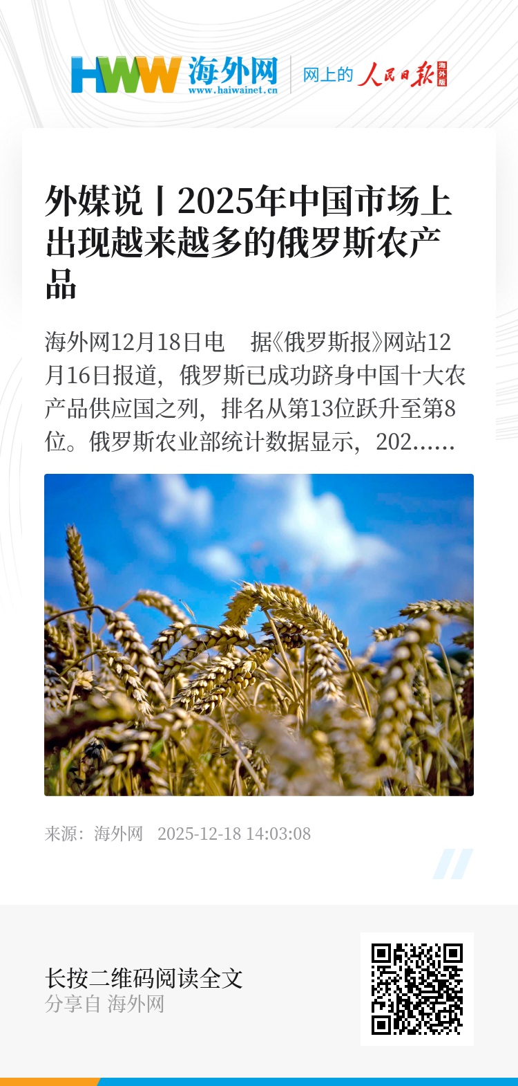 海外网12月18日电 据《俄罗斯报》网站12月16日报道,俄罗斯已成功跻身中国十大农产品供应国之列,排名从第13位跃升至第8位。俄罗斯农业部统计数据显示,2025年前7个月,俄罗斯对华食品出口增长了10%。