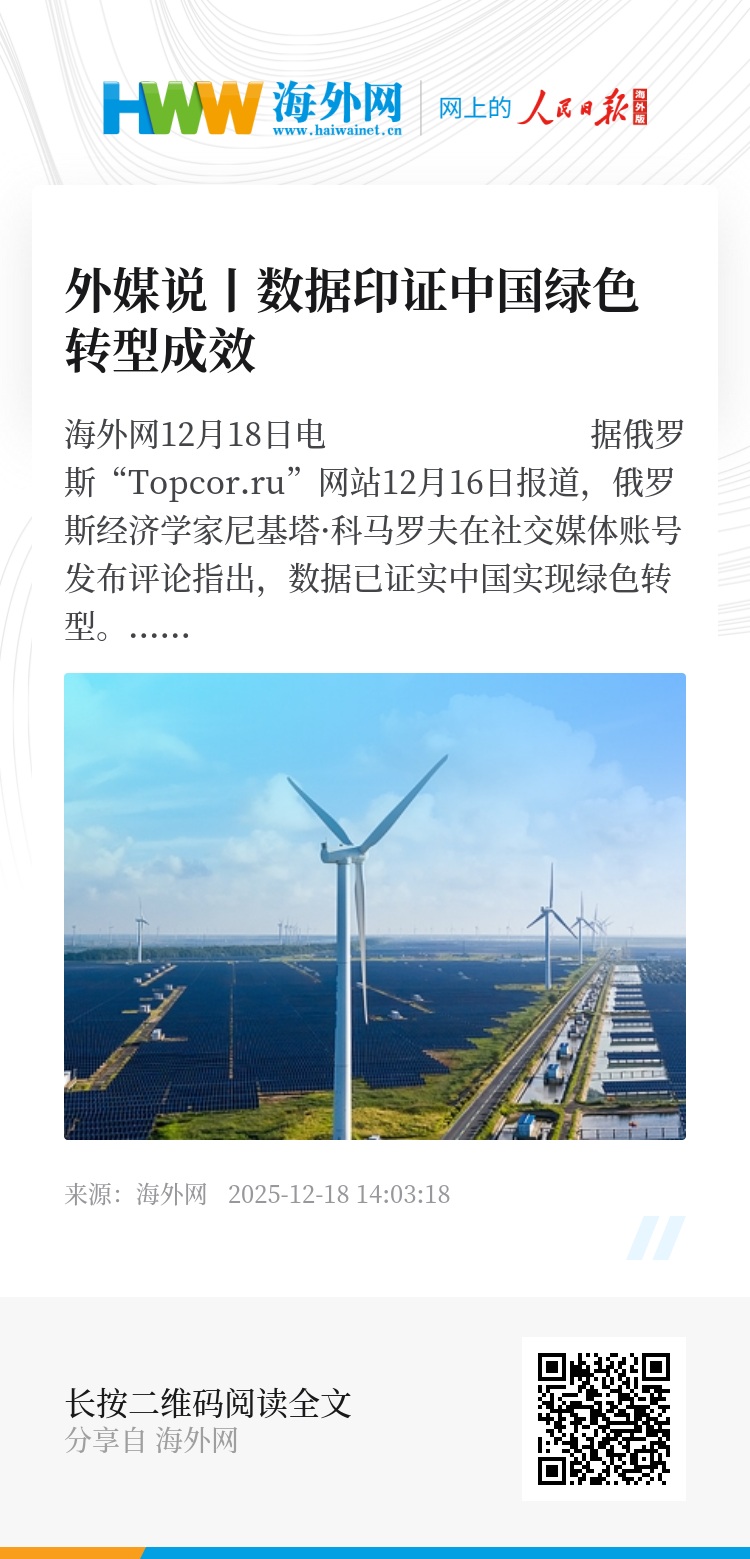 海外网12月18日电 据俄罗斯“Topcor.ru”网站12月16日报道,俄罗斯经济学家尼基塔·科马罗夫在社交媒体账号发布评论指出,数据已证实中国实现绿色转型。