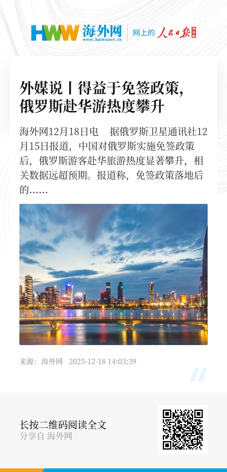 海外网12月18日电 据俄罗斯卫星通讯社12月15日报道,中国对俄罗斯实施免签政策后,俄罗斯游客赴华旅游热度显著攀升,相关数据远超预期。