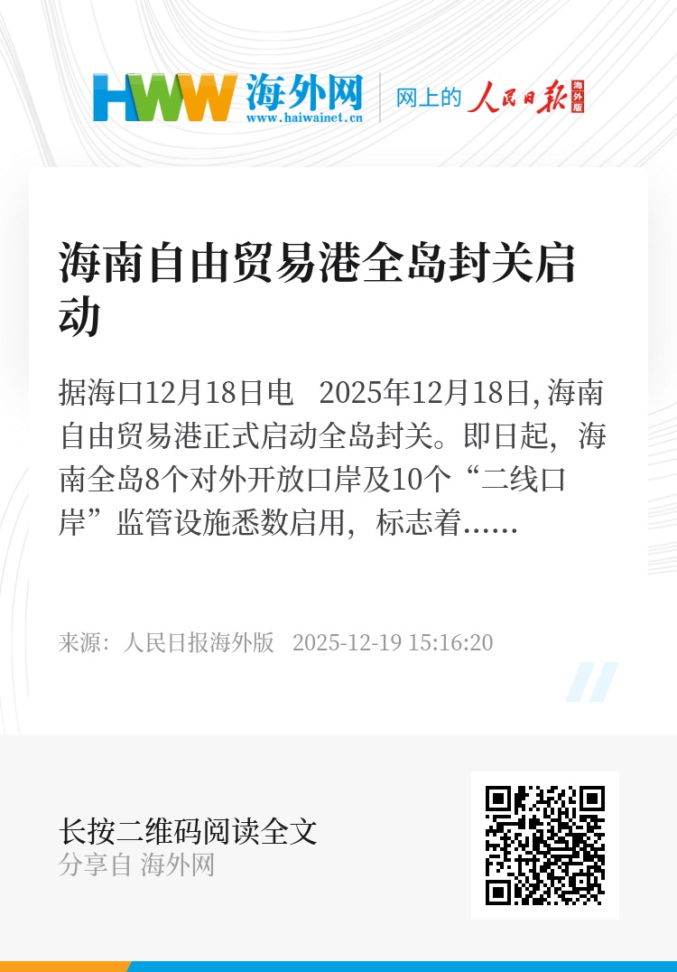 据新华社海口12月18日电 2025年12月18日,海南自由贸易港正式启动全岛封关。