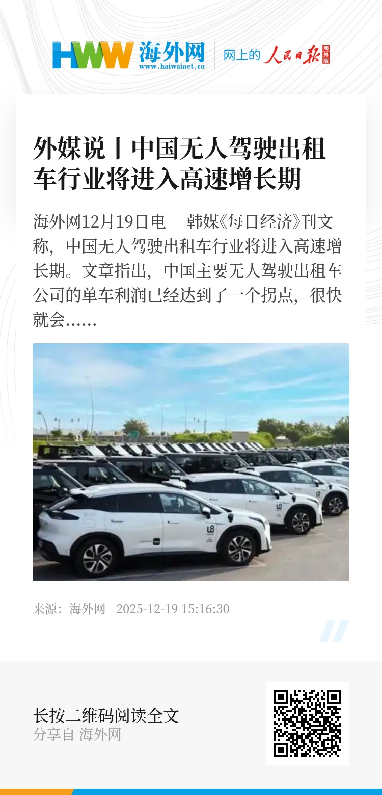 海外网12月19日电 韩媒《每日经济》刊文称,中国无人驾驶出租车行业将进入高速增长期。