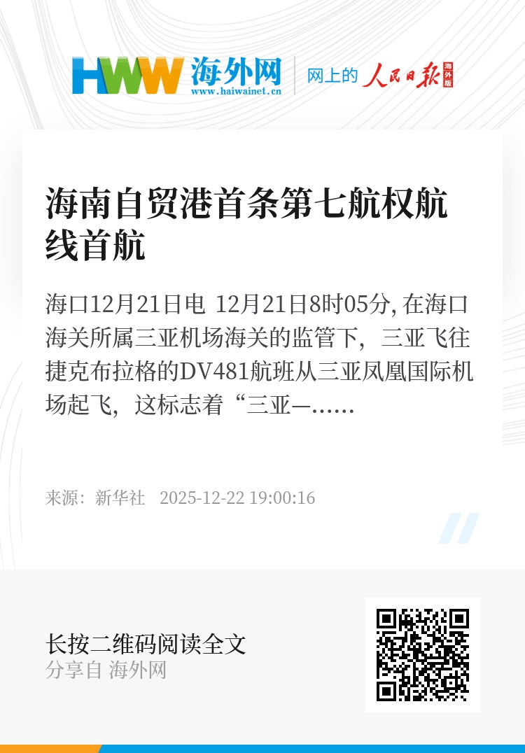 新华社海口12月21日电 12月21日8时05分,在海口海关所属三亚机场海关的监管下,三亚飞往捷克布拉格的DV481航班从三亚凤凰国际机场起飞,这标志着“三亚—布拉格”航线成功开通。该航线成为海南自贸港首条投入运营的第七航权航线。